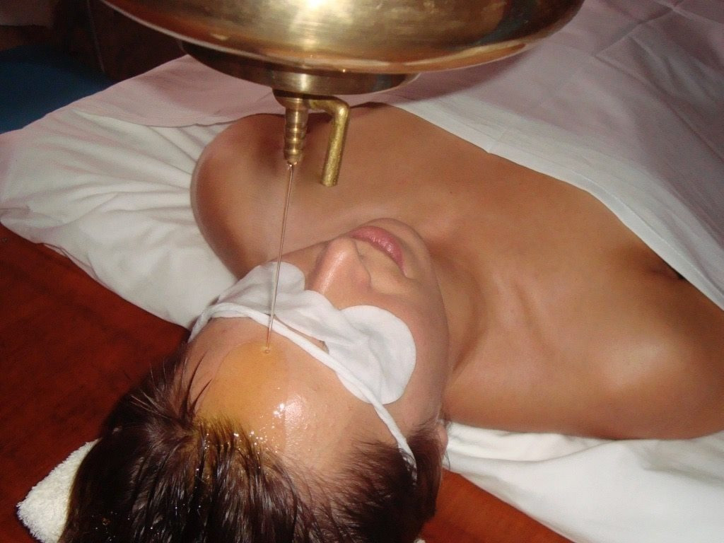 - Shirodhara : Soin profond du système nerveux avec écoulement d’huile tiède sur le front.